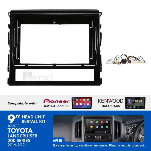 The Aerpro AKTO26 9" Installation Kit comes with all of the components required to install a 9" trapezoid shaped radio into your Toyota Landcruiser 200 (2016-2021) vehicles whilst maintaining important vehicle features such as Steering Wheel Control functionality.