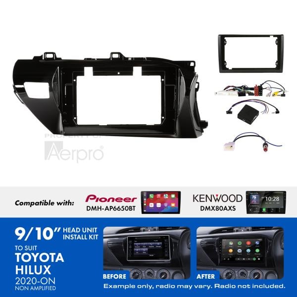 The Aerpro AKTO3 9/10" Installation Kit comes with all of the components required to install a 9/10" trapezoid shaped radio into your Toyota Hilux (2020-) vehicles without factory amplifier, whilst maintaining important vehicle features such as Steering Wheel Control functionality.