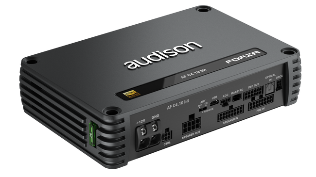 AF C4.10 bit boasts four high-fidelity amplified channels 90W x 4 @4Ω*, 150W x 4 @2Ω*, with the audiophile sound of the latest generation Audison D-Class technology. Higher switching frequencies, steeper filtering, and higher-tolerance components deliver sound above and beyond the expectation of Class D – in an amazingly compact package! This is combined with native DSP working at 24 bit/96 kHz, extending the audio band up to 40 kHz and earning the coveted High-Resolution certification. Bridging channel pairs results in 300 x 2 @4Ω, guaranteeing flexible and powerful performance. Support for the Audison B-Con’s Absolute Volume function guarantees maximum bit depth, even with wireless connections!*Output Continuous Power (RMS) @14.4 VDC, 1% THD, all channels driven.