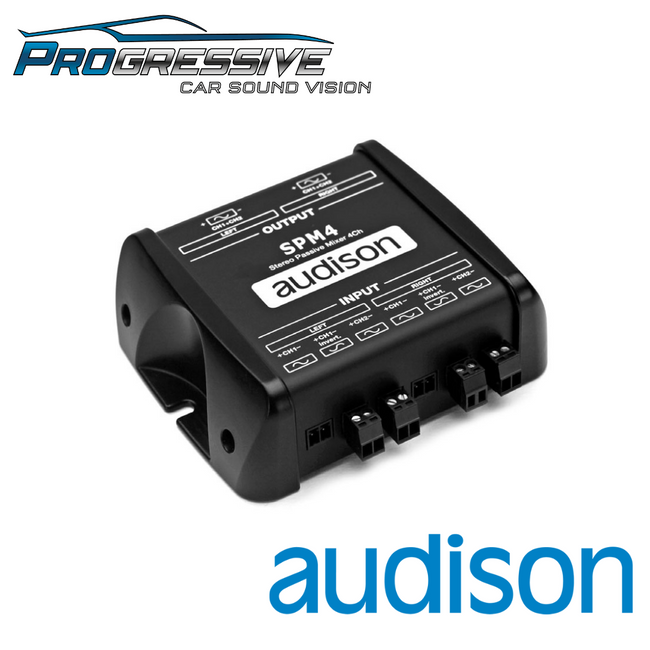 Stereo passive mixer (unpowered) featuring 4 input channels and 2 output channels, designed for active OEM multi-way systems where each speaker is powered by one specific amplified channel. SPM4 mixes audio through 4 audio transformers specifically developed to achieve very low distortion and highly linear acoustic response. SPM4 provides the ability to mix the midrange/woofer and tweeter channels coming from the amplifier and supply one single mid-high channel. The Ch1(L/R) channels feature two inputs, one features an inverting input compared to Ch2 (L/R) channels; the mixing process often gives better results when one of the two channels undergoes a 180° dephasing. SPM4 is especially recommended to extend the number of inputs of the Audison digital processors or amplifiers with built-in DSP because they feature a De-equalizer (De-Eq). In that case, any possible non-linear acoustic emissions due to the mixing of the pre-existing filtered channels are duly compensated.