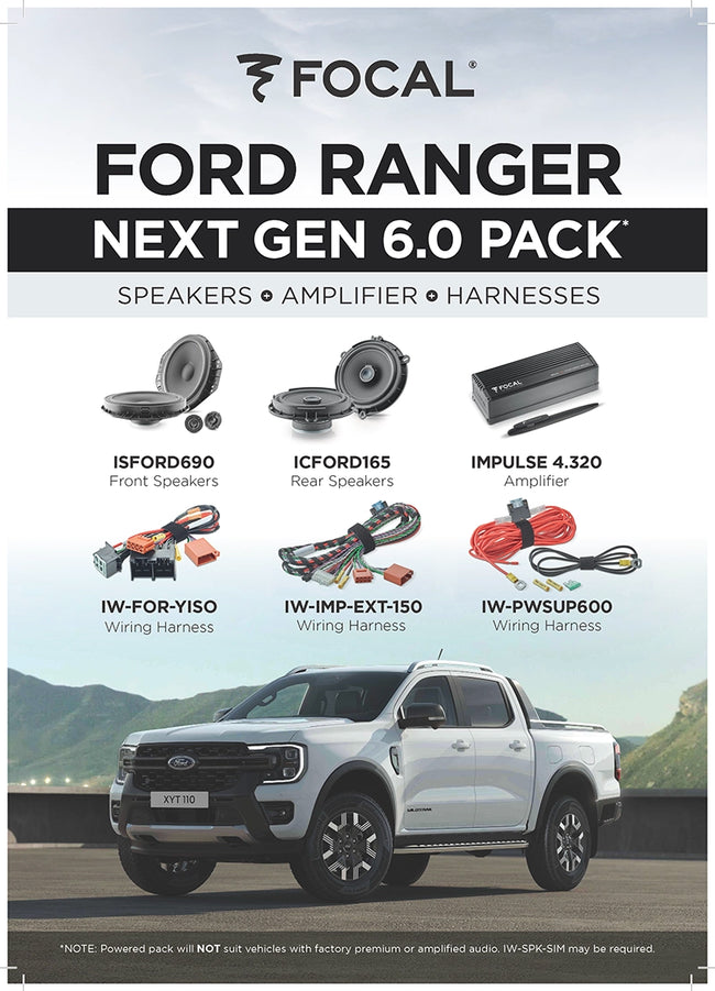 Discover Front: IS FORD 690 Splits Rear: IC FORD 165 Coaxial, Amplifier: Impulse 4.320 2×55 Watts RMS to Front Speakers and 2×80 Watts RMS@2 Ohm to Subwoofer. Harnesses: IMP EXTENSION I/O 150, IW-FORD YISO HARNESS and IW-PWSUP600 NOTE: Powered pack will NOT suit vehicles with factory premium or amplified audio.   FRONT: The IS FORD 690 2-way component kit is designed for all drivers who wish to install a quality sound solution in their vehicle. The speaker drivers feature Polyglass technology, which delivers well defined midrange and bass, and the Aluminium inverted dome tweeter, a Focal technology that provides perfect treble reproduction. Installing this kit does not require any soldering, cable trimming or vehicle modification. The integration is also invisible. REAR: The IC FORD 165 2-way coaxial kit is designed for all drivers who wish to install a quality sound solution in their vehicle. The speaker drivers feature Polyglass technology, which delivers well-defined midrange and bass, and the Aluminium inverted dome tweeter, a Focal technology that provides perfect treble reproduction. Installing this kit does not require any soldering, cable trimming or vehicle modification. The integration is also invisible. AMPLIFIER: Give your head unit a breath of fresh air. Head unit amplifiers (whether OEM or aftermarket) soon reveal their limits in terms of power and dynamics. At high volume, they soon saturate and ruin the listening pleasure. To compensate for this and to enable you to get the best out of your speaker drivers, Impulse 4.320 is the ideal solution. It will give your installation a boost without you having to embark on a difficult installation process. HARNESSES: The Focal Inside FORD Y-ISO HARNESS head unit adaptation cable is designed for the IMPULSE 4.320 compact 4-channel digital amplifier. It allows a quick and simple connection of the Ford original head unit and of Focal Inside extension cables. AND: Compatible with the IMPULSE 4.320 compact 4-channel digital amplifier, the IMP EXTENSION I/O 150 extension cables with Plug & Play connections offer total installation freedom as they can connect each amplifier channel to one of the speaker drivers. Input/output extension: ‘Input’ to send the audio signal from the main unit to the amplifier and ‘output’ to send the signal leaving the amplifier to the original audio system.
