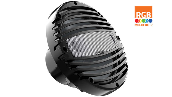 The HMX 8 LD hi-performance marinet coaxial speakers with RGB LEDs lighting option, also available in the black option HMX 8-LD-C, is optimized to perform in infinite baffle, with a solid bass and an outstanding output. The HMX tweeters feature an acoustic lens optimized for best off-axis dispersion and maximized SPL. The attractive stainless steel tweeter mesh grille provides perfect high-frequency transfer and a rock-solid protection. The RGB LED lighting circuit is integrated below the tweeter, protected by a Polypropylene transparent cover acting as light diffusion. The UV-resistant polypropylene cone co-molded with Santoprene rubber surround together with the basket and grille injected with a Hi-temperature and UV resistant polymer neutralize water, dust and mud. The aramid fiber spider with silicone-insulated lead wires ensures durability and constant performance over time. The high-excursion mobile equipment is driven by a massive magnetic group, to deliver high undistorted sound pressure.