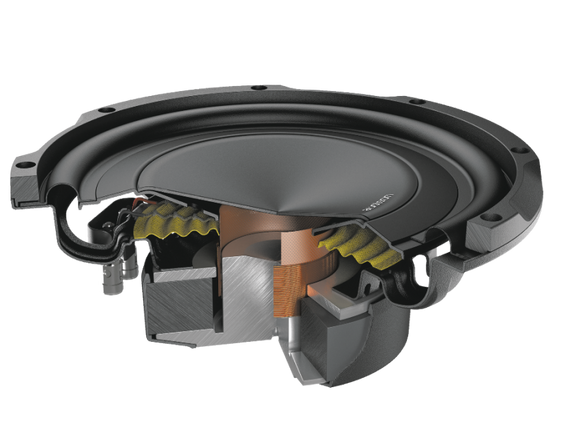 The APS 10 D is designed to deliver maximum performance in a sealed enclosure with ultra-compact volumes, from 10 lt. to 12 lt. The dual voice-coil and single voice coil versions feature push connectors for ease of wiring and configurations. Prima subwoofer components have been developed with a primary goal: to deliver high output in tight spaces. Output is a matter of excursion; the more air the cone moves, the more output. However reduced mounting depth traditionally has meant low excursion. Prima subwoofers employ a special cone-dustcap-basket geometry which guarantees large excursion of the mobile group, while keeping the mounting depth to a minimum. The surround and spider have been carefully designed to prevent the rocking-mode phenomenon. The cooling circuit has been designed with air vents on the basket underneath the spider, eliminating the need for vents on the bottom-plate. This allows the subwoofer to be mounted close to the back wall of the enclosure, making the most of the reduced mounting depth.