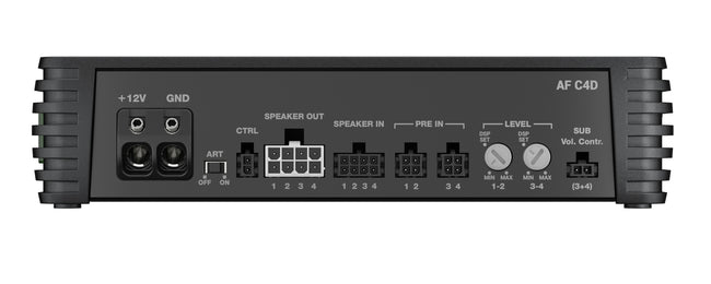 AF companion amplifiers are designed to add powerful amplifier channels to AF bit processor amplifiers. A plug-and-play signal input harness is included to make connection to AF bit amplifiers straightforward. AF companion amplifiers are also perfect for use with systems controlled and managed by a standalone bit processor, such as a bit One HD Virtuoso. AF companions have a “straight wire” architecture, without analog preamp functions such as crossover filtering, and are intended for use with external processors. AF M4D boasts four high-fidelity amplified channels 90W x 4 @4?*, 150W x 4 @2?* with the audiophile sound of the latest generation Audison D-Class technology. Higher switching frequencies, steeper filtering, and higher-tolerance components deliver sound above and beyond the expectation of Class D – in an amazingly compact package! The audio band is extended up to 40 kHz earning the coveted High-Resolution certification. Bridging channel pairs results in 300W x 2 @4?*, guaranteeing flexible and powerful performance.