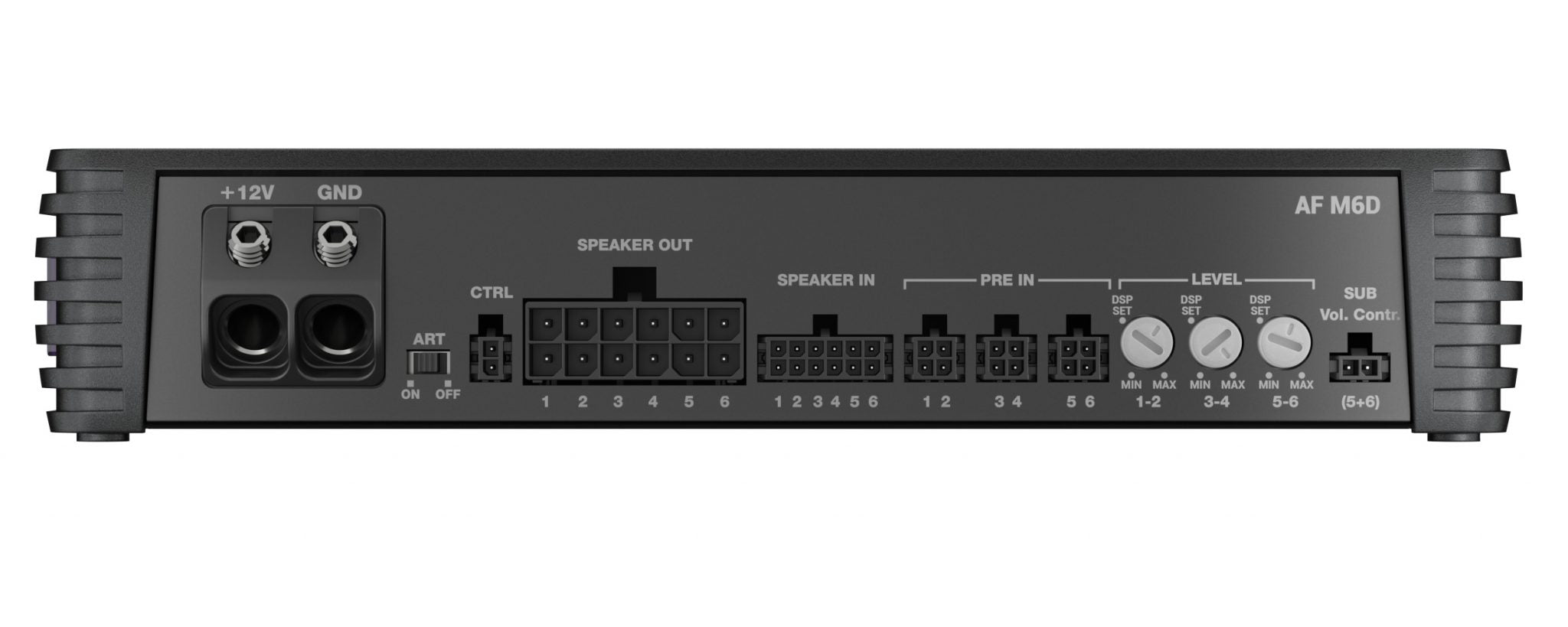 AF companion amplifiers are designed to add powerful amplifier channels to AF bit processor amplifiers. A plug-and-play signal input harness is included to make connection to AF bit amplifiers straightforward. AF companion amplifiers are also perfect for use with systems controlled and managed by a standalone bit processor, such as a bit One HD Virtuoso. AF companions have a “straight wire” architecture, without analog preamp functions such as crossover filtering, and are intended for use with external processors. AF M6D boasts six high-fidelity amplified channels 135W x 6 @4?*, 220W x 6 @2?*, with the audiophile sound of the latest generation Audison D-Class technology. Higher switching frequencies, steeper filtering, and higher-tolerance components deliver sound above and beyond the expectation of Class D – in an amazingly compact package! The audio band is extended up to 40 kHz earning the coveted High-Resolution certification. Bridging channel pairs results in 440W x 3 @4?*, guaranteeing flexible and powerful performance. *Output Continuous Power (RMS) @14.4 VDC, 1% THD, all channels driven.
