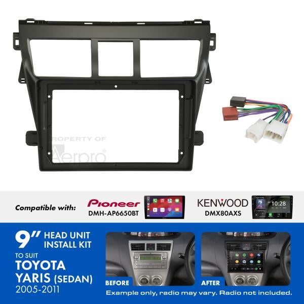 The Aerpro AKTO15 9" Installation Kit comes with all of the components required to install a 9" trapezoid shaped radio into your Toyota Yaris Sedan vehicles.