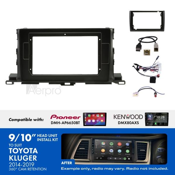The Aerpro AKTO38 9/10" Installation Kit comes with all of the components required to install a 9/10" trapezoid shaped radio into your Toyota Kluger (2014-2019) vehicles with factory 360 camera, whilst maintaining important vehicle features such as Steering Wheel Control functionality.