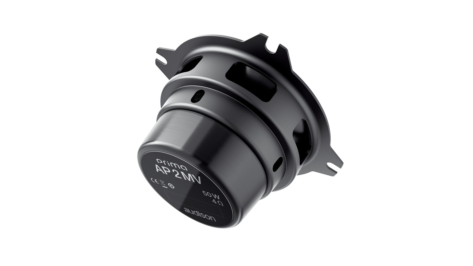 Prima AP 2 MV wide-range car audio reproduces the entire range of mid and high frequencies and is perfect for cars of the GM, Ford, and Toyota groups with 50 mm (2 in.) OEM placements in the dashboard or A-pillar, where it is combined with an elliptical woofer in the car door. The provided adapter allows direct OEM replacement for many General Motors*, Toyota* and Mercedes* vehicles. The compact size and excellent electroacoustic parameters make it ideal also to be used as a midrange in 3-way systems, as a surround speaker, or as a central channel, housed in OEM placements, where the space requirements would not allow the use of a speaker with a larger diameter. The advantage of emitting the entire spectrum of frequencies by itself, responsible for creating the virtual stage with absolute phase coherence, ensures a wide acoustic scene concentrated on the upper side of the dashboard. The very low distortion and the lack of crossover point in the mid-high range also provide a natural and pleasant listening experience. Through careful research and simulation, the R & amp;D team was able to maximize electroacoustic performance for a typical OEM application. The resonance frequency of 145 Hz, a very low value for a 50 mm (2 in.) loudspeaker, was obtained thanks to the use of a 25 mm (1 in.) voice coil, ensuring a controlled extension at low frequencies for an optimal crossover point with the woofer. The aluminum cone, in combination with the copper shorting ring that flattens the impedance, allows for the response to be extended up to 20 kHz. The special magnetic group made with a double symmetrical Neodymium magnet also contributes to achieving this exceptional extension at high frequencies while maintaining very compact dimensions. This electroacoustic configuration has led to obtaining a particularly wide frequency response, which extends from 150 Hz up to 20 kHz, giving the AP 2 the well-deserved name of a wide range.