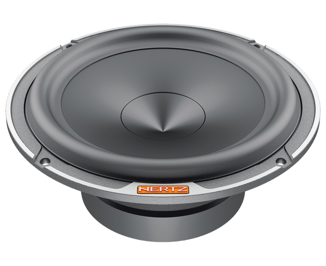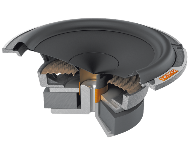 The MP 165P.3 car audio woofers electro-acoustic parameters have been forged to give it the pure and solid sound of an authentic mid-bass, designed for high dynamic systems. The voice coil with a generous 14 mm height, has a nominal 3 Ω impedance in addition to an increased power handling. These features provide the ability to maximally exploit the power of the Hertz HCP and HDP amplifiers as well as all the 2 Ω stable electronics. The ferrite 95 mm diameter magnet enables a +/-4.5 mm voice coil linear excursion, ensuring utmost control at all times. The Boundary Free Surround moves a bigger amount of air, and the V-cone® profile improves the offaxis dispersion, the real in-car listening condition. The sophisticated aluminium alloy basket neutralizes the undesired vibrations.
