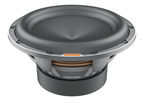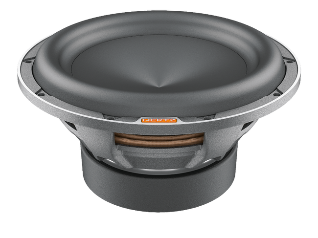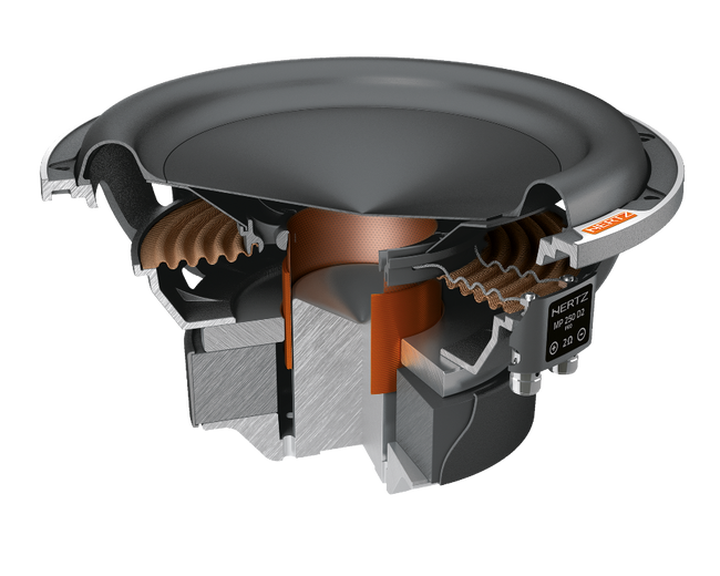 Outstanding performance in a compact size, this is the target of Mille Pro car audio subwoofers. On the strength of its know-how acquired with Mille Legend, the R&D team has optimized the production process to offer the “Hertz Sound Experience” to a wider audience using part of the technologies and materials of the flagship line. The MP 250 D2.3 cone is made by pressing paper pulp with the injection of mineral powders, the same construction technique used for Legend. The V-cone® profile increases rigidity, allowing the cone to function like a piston. Surround materials consist of high-purity IIR-butyl rubber. Like the Legend ML2000.3 and ml2500_3, the Mille PRO subwoofers are built with Boundary Free Surround technology allowing for a greater emission surface with equal diameter, generating higher sound pressure. The compact 6-spoke aluminum alloy anti-resonant basket is the same as the top model ML 2500.3 and contributes to the subwoofer’s mechanical damping, being absolutely transparent to the sound. The 65-mm 4-layer voice coil is higher than 60 mm and wound in a TIL-P former, thus delivering high linear displacement. The 2 Ω + 2 Ω DVC impedance configuration improves versatility to match any amplifier system. The air cooling and decompression system avoids the need for a centre hole on the bottom plate with three advantages:
