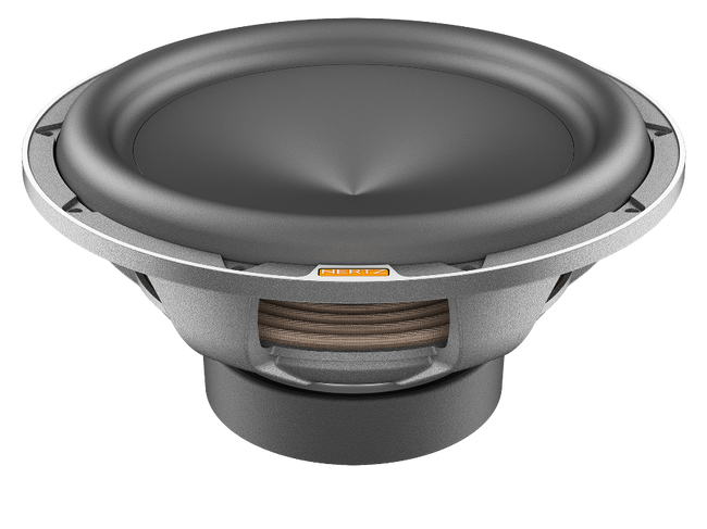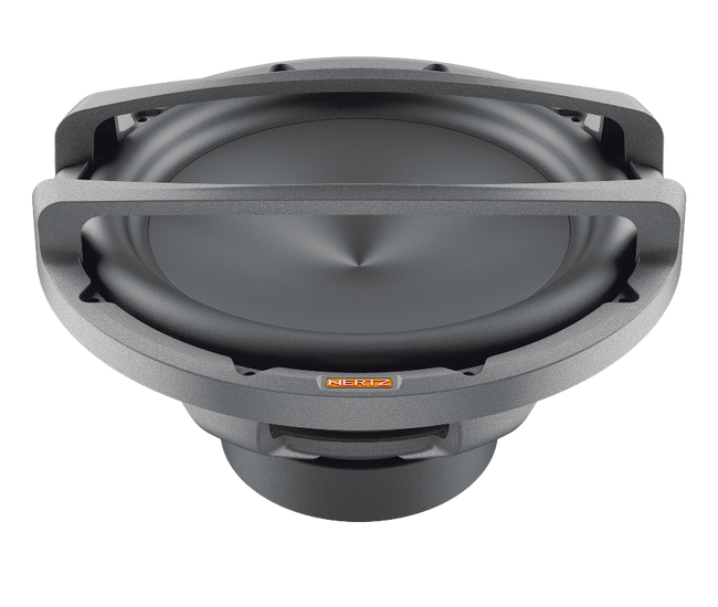 Outstanding performance in a compact size, this is the target of Mille Pro car audio subwoofers. On the strength of its know-how acquired with Mille Legend, the R&D team has optimized the production process to offer the “Hertz Sound Experience” to a wider audience using part of the technologies and materials of the flagship line. The MP 300 D2.3 cone is made by pressing paper pulp with the injection of mineral powders, the same construction technique used for Legend. The V-cone® profile increases rigidity, allowing the cone to function like a piston. Surround materials consist of high-purity IIR-butyl rubber. Like the Legend ML2000.3 and ml2500_3, the Mille PRO subwoofers are built with Boundary Free Surround technology allowing for a greater emission surface with equal diameter, generating higher sound pressure. The compact 6-spoke aluminum alloy anti-resonant basket is the same as the top model ML 2500.3 and contributes to the subwoofer’s mechanical damping, being absolutely transparent to the sound. The 65-mm 4-layer voice coil is higher than 60 mm and wound in a TIL-P former, thus delivering high linear displacement. The 2 Ω + 2 Ω DVC impedance configuration improves versatility to match any amplifier system. The air cooling and decompression system avoids the need for a centre hole on the bottom plate with three advantages: