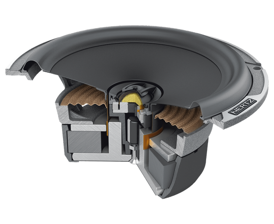 The coax tweeter concentric to the woofer of the MPX 165.3 car audio coaxial speakers allows for one single linear-phase emission point, for a natural timbre providing a detailed sound stage. Thanks to the “Center Tuning Duct” geometry, the tweeter resonance frequency is especially low and the employment of damping materials for the inside provides for a linear acoustic emission. The acoustic lens optimizes its off-axis response, which is typical with door installation of coax speakers; besides, the 36 mm diameter woofer generates deep and controlled bass frequencies.